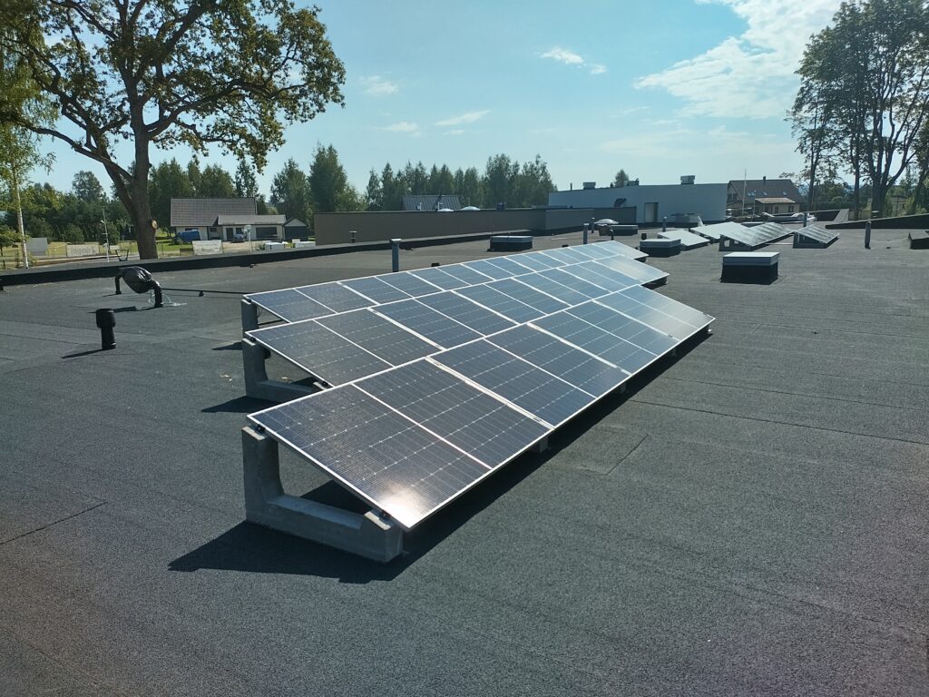15kW Päikesepark Tuigo Lasteaia katusel. Paigaldatud päikesepaneelid lamekatusele FixSol kivikanduritele.